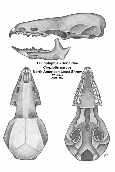 Skull & dentary. University of South Alabama #619 Alabama, Mobile County, Mobile. Formerly as Cryptotis parva. Formerly Soricomorpha.